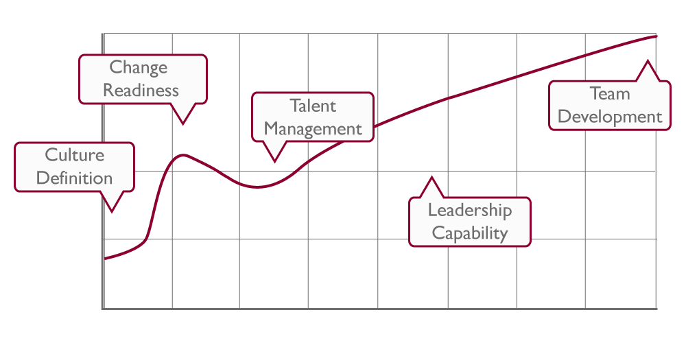 Every organisation is different, so there are no hard and fast rules. No matter what the context, our aim is to maximise the potential of your organisation and avoid the risk of performance downturns, through predicting your needs in the areas of Culture, Change, Talent, Leadership and Teams. The chart below summarises the types of challenges organisations may face and the types of support Potency can offer to address these.
